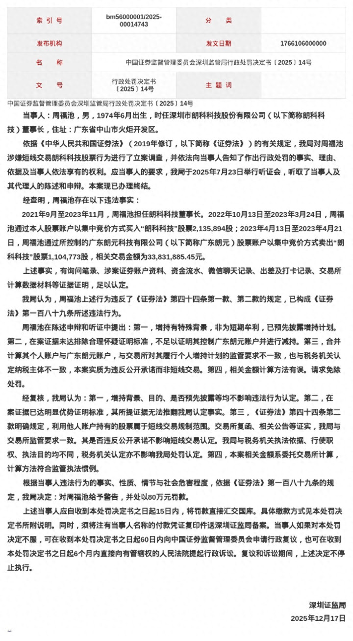 蓝鲸新闻12月19日讯,近日,深圳证监局发布了行政处罚决定书,剑指时任深圳市朗科科技股份有限公司董事长周福池。