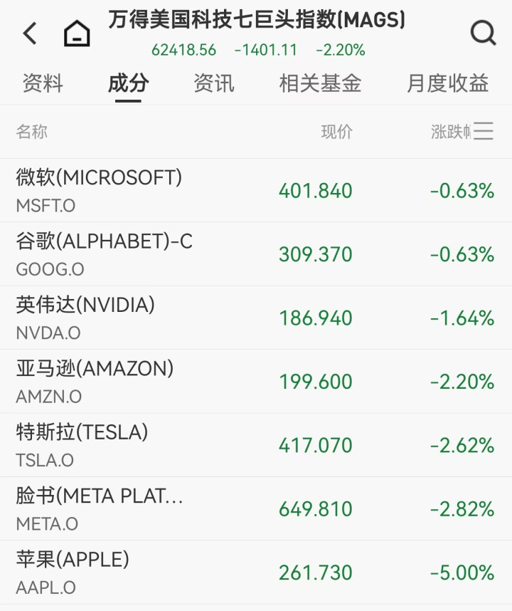 科技七巨头集体下挫,万得美国科技七巨头指数下跌2.20%。苹果大跌5%,创下2025年4月以来最大单日跌幅,有报道称其升级版Siri计划遭遇推迟。Meta、特斯拉、亚马逊跌幅均超2%,英伟达下跌1.64%,微软和谷歌母公司Alphabet均跌0.63%。