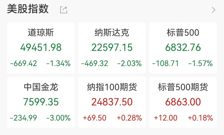当地时间2月12日,美股剧烈调整,三大股指全线收跌,纳指以2.03%的跌幅领跌。道琼斯工业指数下跌669.42点,跌幅1.34%,报49451.98点;标普500指数下跌108.71点,跌幅1.57%,报6832.76点;纳斯达克综合指数下跌469.32点,报22597.15点。市场恐慌情绪蔓延,科技股成为重灾区。
