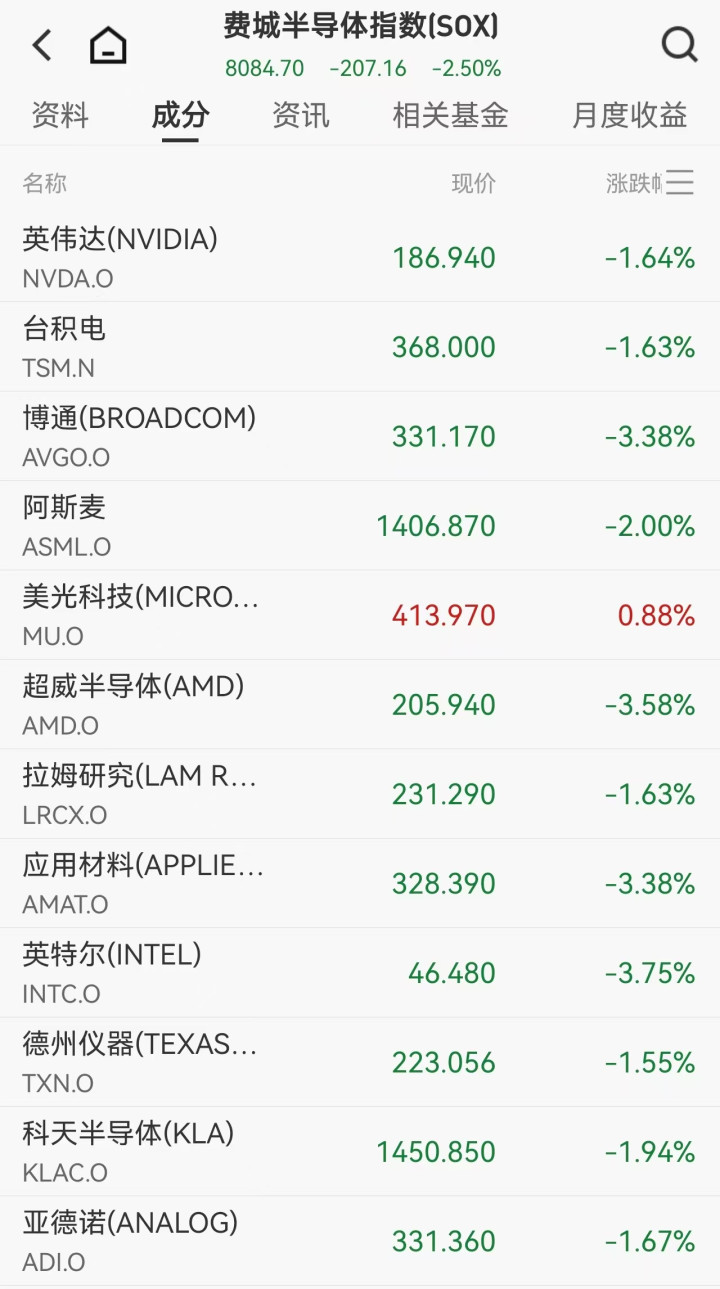 芯片股普遍受挫,费城半导体指数下跌2.50%。成分股中ASTERALABS跌近12%,英特尔、超威半导体、博通等跌超3%。思科大跌12%,其季度毛利率低于预期,被视为传统科技企业在AI浪潮中承压的信号。