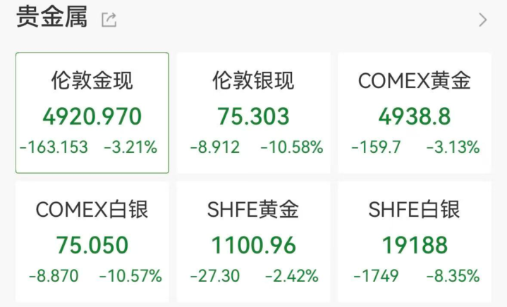 大宗商品市场同步震荡。现货白银价格暴跌10.73%,报75.224美元/盎司;金价下跌3.17%,跌破5000美元关口。原油期货收跌约2.7%,WTI原油报62.84美元/桶。交易员重新评估美联储政策路径,CME美联储观察显示6月前降息概率不足50%。